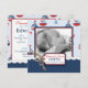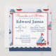 Nautiska färger i klassiska röda, vita och blå segelbåtar med ankare och krabbor och en nyhet 3D-look pojke etikett med tråd födelseannons.