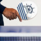 Den här bilden har ett båthjul, ett ankare på en marin blå och vit strimlad bakgrund.