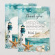 Vackert bröllop tack för ett kort med sjömanssvart och vit fyr, stjärnfisk och snäckor. Perfekt för ett bröllop. Ord kan ändras till kostym med dina egna uppgifter eller krav
