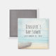 Babydusch eller födelsedag spara datum magneter med en vacker, rustik bild. Diskret färg av ljusblått, sandbrunt och milt vitt. En strandscen med en båt på stranden med ett fiskenät hängande på sidan. En elegant ska se ut.