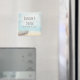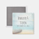 Bröllop spara datum magnet med en vacker rustik bild. Diskret färg av ljusblått, sandbrunt och milt vitt. En strandscen med en båt på stranden med ett fiskenät hängande på sidan. En elegant ska se ut.