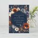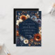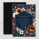 Evoking a sense of twilight romance, this design features a rich palette of deep blues, burnt oranges, and soft creams. Delicate floral elements, reminiscent of poppies and autumnal foliage, are scattered across the composition, creating an atmosphere of rustic elegance. This artwork is perfect for a moody and sophisticated celebration.