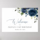 Navy Blåa blommor, Greenery, Birthday Welcome Poster