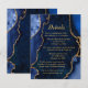 Celebrate every detail of your wedding with this navy blue and gold agate marble details card. Rich midnight blue hues, organic stone textures, and shimmering gold accents combine to create a sophisticated, jewel-toned design that complements a modern, elegant, or glamorous celebration. The striking contrast of navy blue and metallic gold provides a polished backdrop for sharing both reception and lodging information, keeping your guests informed in style. Fully customizable with your event schedule, hotel details, and special notes, this agate-inspired card adds a cohesive and refined touch to your wedding stationery suite, perfect for fall or winter weddings.
