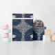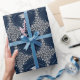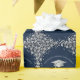 This modern design features a graduation hat and confetti in silver on a background of navy blue with white text.