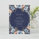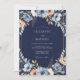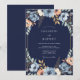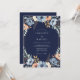 This design features a rich navy background enveloped by a vibrant floral garland. Lush blue and soft peachy-blossoms intertwine with autumnal foliage, creating a warm and inviting atmosphere. The botanical elements evoke a sense of refined elegance.