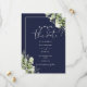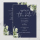 Denna eleganta marinblå botaniska grönska blommiga spara-datum-inbjudan kan anpassas med din information i chic typografi med din bröllopswebbplats QR-kod och detaljer på baksidan. Designad av Thisisnotme©