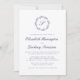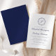 Den här inbjudan från elegant bröllop har en marin blå manus-monogram som inledningsvis omges av en botanisk andedräkt på en vit bakgrund. Namn visas i marint blått skript, medan resten av texten visas i klassiskt serif-teckensnitt. Kortets baksida är fast marin blå.