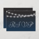 Ett modernt Bröllop OSA Response Card i en marin blå vattenfärgreffekt med bleka penseldrag. Högst upp på samordningskortet finns två strängar av mousserande sträng ljus med bakgrunden som faux night himlar.