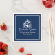 This professional realtor paper napkin is custom made with your real estate company name under the modern cursive script for an open house. This chic navy blue realty business party decor features a house logo image for home builder or realty agent company marketing.