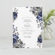 This design features a sophisticated palette of deep navy blue and charcoal gray floral arrangements. Large, velvety roses are accented by delicate blossoms and silvery-toned leaves, creating a stately and elegant mood. Set against a crisp white background, the painterly blooms evoke a timeless, formal atmosphere perfect for a winter or evening affair.