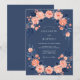 This design showcases a deep navy blue background paired with a vibrant arrangement of peach and coral roses. The dark blue foliage creates a moody and sophisticated botanical aesthetic suitable for winter or formal ceremonies. Soft watercolor details and blooming floral elements provide a romantic and timeless look. The rich palette and floral accents evoke an atmosphere of elegance.