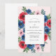 This design features a rich palette of navy blue and ruby red anemones complemented by soft blush roses. The watercolor aesthetic creates a romantic and artistic atmosphere, perfect for a seasonal nuptial. Lush green foliage and vibrant blooms are arranged to accent the central composition.