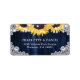 Rustic navy blue floral wedding address labels featuring sunflowers, string lights and delicate floral lace against a rustic wood background.
