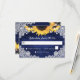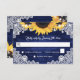 Rustic navy blue and sunflower wedding RSVP card featuring sunflower flowers, burlap hearts, white floral lace and string lights against a rustic wood background. Perfect card design to complement your navy blue rustic wedding party inspired by sunflower flowers. Matching items available.
