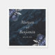 These elegant wedding napkins feature the couple's names in silver gray italics, joined by word "and" in silver gray handwriting calligraphy with swashes at the beginning and end. Add the wedding date below in serif font. A pair of navy blue floral bouquets set off with silver faux foil foliage appear in two corners, on a background image of dark navy blue watercolor agate. See our collection for matching wedding invitation suite and day-of stationery.