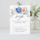 Navyblå blush rosa blomsterbröllop RSVP-kort med elegant bukett av marinblå, kunglig blå, vit, blush trädgårdsros, hortensia och salvia gröna eucalyptusblad. Vänligen kontakta mig för hjälp med anpassning eller om du behöver någon annan produkt med denna design.