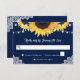 Rustic navy blue and sunflower wedding RSVP card featuring sunflowers and string lights against rustic burlap background adorned with white floral lace. Perfect card design to complement your navy blue rustic wedding party inspired by sunflower flowers.