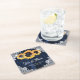 Navy blue rustic wedding paper coasters featuring sunflowers, string lights and delicate floral lace on a barn wood background. Matching items available.