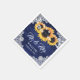 Rustic navy blue and sunflower wedding paper napkins featuring sunflowers, string lights and delicate floral lace on a rustic wood background.