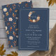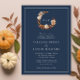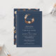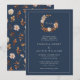 Denna eleganta och moderna bröllopsinbjudan har en krans av handmålade akvarellblad i bränt orange och terrakotta, krämfärgade och beige dahlior och vackra rostfärgade rosor på en marinblå bakgrund med brudens och brudgummens monogram. Hitta matchande föremål i Navy Autumn Romance Collection.