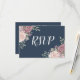 Dessa RSVP-bröllopskort har stora rosor i nyanser av ljust rosa och dammig rosa på en marinblå bakgrund. Du kan anpassa typsnittet och färgen till vad du vill. Detta är en del av en matchande brölloppsserie som kan fullständigt anpassas.
