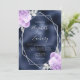 Denna eleganta moderna bröllopsinbjudan har en silvergeometrisk ram dekorerad med lila och silverblommiga buketter på en navyblå falsk folie bakgrund. Den anpassningsbara texten kombinerar silvergrå fantasifull handskrift, kopparstick och kursiva teckensnitt.