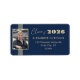 Denna Klass 2026 stiliga examensadressetikett har guldremsor, fotoram och text på en marinblå bakgrund.