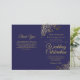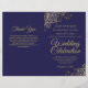 Denna kombinerade bröllopsinbjudan och program har en elegant marinblå och guld design med känsliga falska foliekrullar och virvlar i hörnen. Framsidan har inbjudan medan insidan har detaljer om ceremonin och brölloppsfesten. Baksidan har utrymme för ett tackkort.