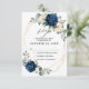 Mörk marinblå blomster-RSVP-kort med elegant bukett av marinblå, kunglig blå, vit, guld, champagne elfenben, rosafärgad ros, hortensia, ranunkel, peon, blomknoppar och salvia gröna eucalyptusblad och elegant akvarell med rund glitter geometrisk neutral ram. Vänligen kontakta mig för hjälp med anpassning eller om du behöver någon annan produkt med denna design.