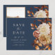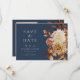 Denna eleganta bröllopsprogram-handfläkt har handmålade akvarellbrända orange och terrakotta blad, kräm och beige dahlior, och vackra rostfärgade rosor på en marinblå bakgrund. Baksidan har en matchande blomster- och bladbouquet med ett foto. Hitta matchande föremål i Navy Blue Autumn Romance Collection.