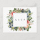 Vattenfärg lummig grönska och blommor i vackra nyanser av marinblå, korall, persika och rosa, bröllopsvar med låtförfrågan postkort. Anpassa text, typsnitt stil, färg och storlek.