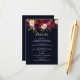 FÖRÄNDERLIG BAKGRUNDSFÄRG. Bröllopsinformationskort i bohemisk stil med akvarellillustration av burgunderfärgade, marsalafärgade, röda och rosa peonior och rosor med fjäderaccent på marinblå bakgrund. Perfekt för höst-/vinter- och blommiga och bohemiska evenemang. Matchande artiklar finns också tillgängliga.