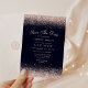 Meddela din bröllop med detta eleganta Spara datum-kort med en lyxig marin bakgrund och en kaskad av skimrande rose gold konfetti. Den moderna och minimalistiska designen är perfekt för par som uppskattar en touch av glitter och sofistikation. Personifiera det med era namn och bröllopsdatum för att skapa en unik souvenir som era gäster kommer att värdesätta.