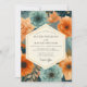 Elicit a sense of opulent romance with this stunning artistic floral design. The composition features lush, painterly chrysanthemums and roses in vibrant paprika orange and muted teal tones. These dramatic blossoms are set against a deep navy background, creating a moody and sophisticated atmosphere. This beautiful botanical arrangement is perfect for a chic and memorable autumn affair.
