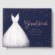 Elegant bröllopsdusch gästbok funktion vattenfärg vit bröllopsklänning med gnistra falskt roséguld glitter gästbok skrift på marinblå bakgrund.