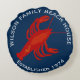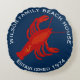 Röd, vit och blå, rund röd hummerfamilj strandhus kastkudde. Anpassa med böjd, tryckt text högst upp och längst ner. Inkludera familjens namn och etableringsår. En stor hummer siluett i mitten.