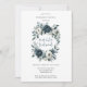 En sofistikerad bröllopsinbjudan med en marinblå akvarellblomma kransad med frodiga peonior, rosor och eukalyptusgrönska i nyanser av marinblått, grönt och elfenben. Designen förstärks av en silvergrå tryckt låda under kransen med modern typsnittslayout. Baksidan av inbjudan fortsätter temat med ett matchande blommigt arrangemang för en sammanhängande och elegant look. Perfekt för par som söker tidlös och klassisk brölloppsbrevpapper.