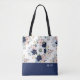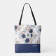 Denna väska är designad med en marinblå kant, en vintageblomsterbukett i olika nyanser av blått och en plats för text eller namn! Personalisera med ett namn eller text som du väljer.