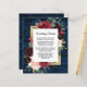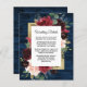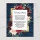 Designen har en mörk navyblå brädgårdstextur bakgrund dekorerad med en elegant blomsterkrans av peonrosor, eukalyptusgrönska och mer i nyanser av burgunder, Marsalröd, vinröd, rosablush osv. Designen har också en tryckt guld färgad kant under blomsterkransen för en modern utseende.