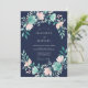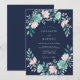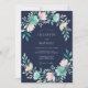 Denna design har en djup midnattsnavy bakgrund som får de pastellfärgade blomsterelementen att poppa ut. Mjuka rosabruna peonior och mintgröna akvarellblommor skapar en romantisk och eterisk estetik. Frodig tealgrön lövverk och ömtåliga blad ramar in toppen och botten för en balanserad, botanisk känsla. Perfekt för en sofistikerad kvällsevenemang eller ett säsongsövergångstema.