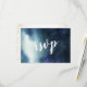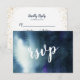 Elegant svarskort för ditt bröllop med tema navyblått och guld! Detta kort har en vacker, handmålad akvarellbakgrund i navyblå ombre-färg. Det står "rsvp" med modern script-teckensnitt. På baksidan finns guldglitter på båda sidor av kortet, och gästerna kan skriva sitt namn, antal deltagare och sitt val av måltid för mottagningen. Texterna kan enkelt anpassas online.