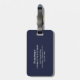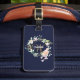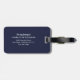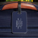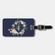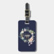 Vacker monogramresemärketagg med vacker namntext och ett kompletterande guldbokstav initial som ramas in av en delikat akvarell blommande ros garnering på en navyblå bakgrund. Designad av Thisisnotme©