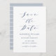 Meddela din vigseldate till familj och vänner med detta anpassningsbara kort för att spara datumet. Det har minimalistisk typsnitt och enkel typografi med randigt mönster på baksidan. Färgerna på detta meddelande är vita och marinblå, perfekta för alla bröllopsteman. Anpassa genom att lägga till namn, datum, lokal och andra evenemangsuppgifter.