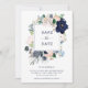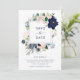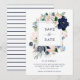 Detta stilrena bröllop save the date-kort har en ram med marinblå, ljusblå och rosafärgade akvarellblommor med gröna och neutrala beige blad. Baksidan av kortet har marinblå och vita ränder.
