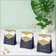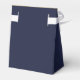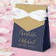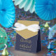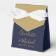 En elegant bröllopspresentlåda med guldstiliserade signerande skriptnamn och speciellt datum i chic typografi på en navyblå bakgrund. Du kan anpassa med ditt eget tackmeddelande under locket. Ett perfekt sätt att tacka dina gäster! Designad av Thisisnotme