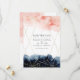 Bröllopsinbjudan med marinblå och rosa akvarellfläckar och en gyllene geometrisk ram.