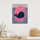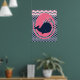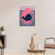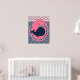 En posters med en rosa val på marinblå bakgrund, perfekt för barnens rum eller för ett större barns rum, med randiga chevronmönster!