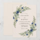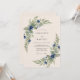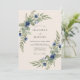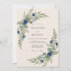 Denna design har en delikat arrangemang av navyblå vilda blommor och frodig, grön salvia. Handmålad akvarell eukalyptus och texturerade ormbunkar skapar en naturlig, organisk kant mot en mjuk, krämfärgad bakgrund. Paletten är luftig och sofistikerad, vilket gör den idealisk för en elegant utomhusfest under de varmare månaderna.