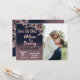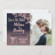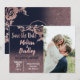 Elegant, chic och enkel modern falsk tryckt roséguld glitter, blommor och typografi på modern marinblå bakgrund, Spara-datum bröllopskort. Denna klassiska och sofistikerade design är perfekt för det trendiga och stiliga paret som gifter sig. Personifiera med ditt eget meddelande på framsidan samt en anpassad monograminitial på baksidan. Alla fototryckdesign.